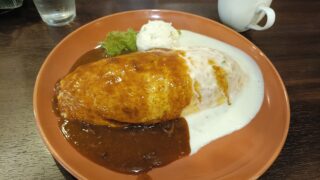 レオンさんに伺ってきました。店頭のメニューを確認しておきましょう。店内のメニューは壁に掲示してあり、着席の位置が悪く写真が撮れませんでした。wハーフ&ハーフオムライスを頂きました。良いねぇ